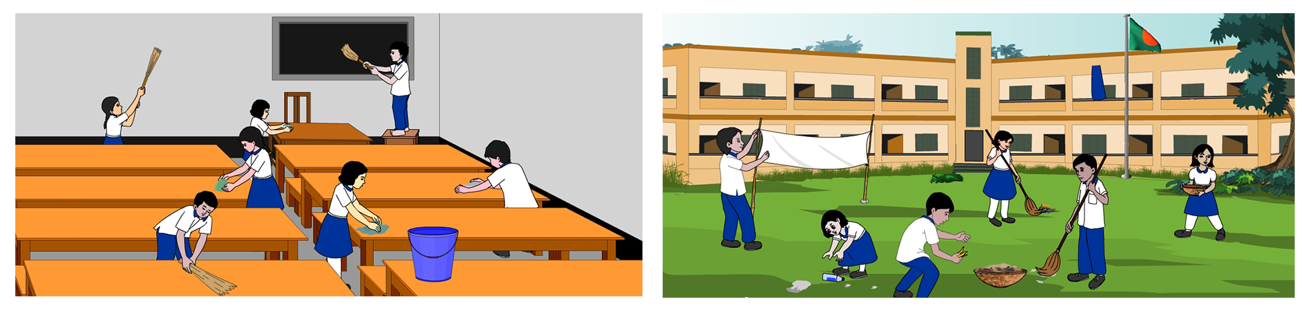 "Why is the classroom so dirty?" asks Ms Saha. "I know the school cleaner is absent today. So what? Can't we ourselves keep our classroom clean?"says Ms Saha. "Sorry teacher," Shafiq, the class captain, says politely. "This is our classroom. If you clean it, you will do physical work and feel good. Also it is our responsibility to keep it clean and tidy", says Ms Saha.
