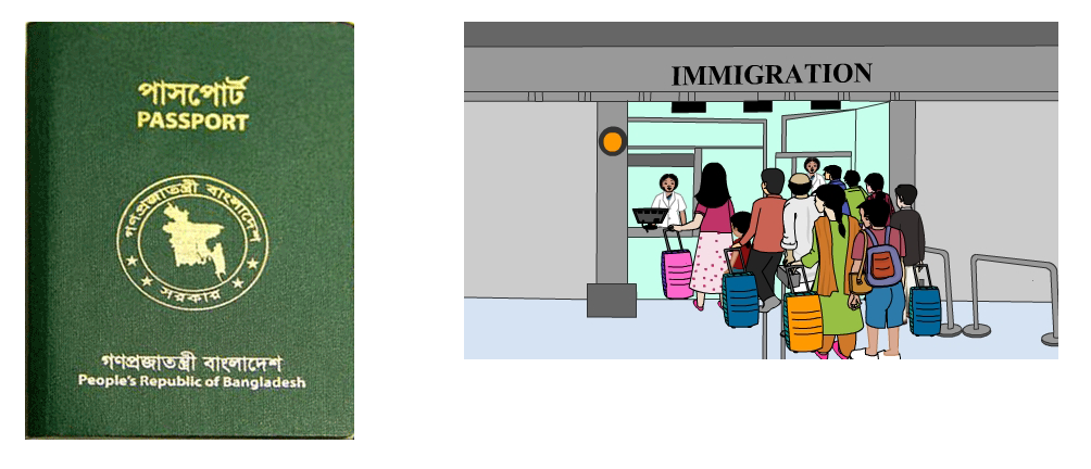 Zara's parents Mrs Jhuma Islam, Mr Mazharul Islam, Zara and Mita, fill in their departure cards and move towards the immigration counter. Mita stands in front of one of the booths. She hands in her passport and the departure card to the officer.
