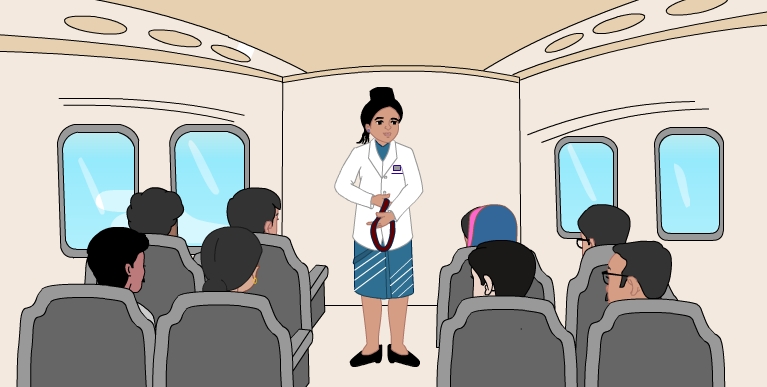 Oxygen and the air pressure are always being monitored. In the event of a lack of oxygen, an oxygen mask will automatically appear in front of you. Pull the mask towards you and place it firmly over your nose and mouth. Secure the elastic band behind your head, and breathe normally. If you are travelling with a child or someone who requires assistance, secure your mask first, and then assist the other person. Keep your mask on until a uniformed crew member advises you to remove it.