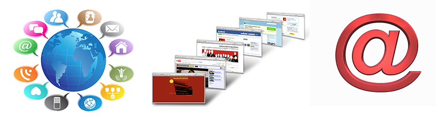 In the first picture we see some logos around a globe. We find them while browsing Internet. In the second picture we see the pages of some online newspapers and magazines. In the third picture we see a symbol which is called at the rate of. It is used in an e-mail address.