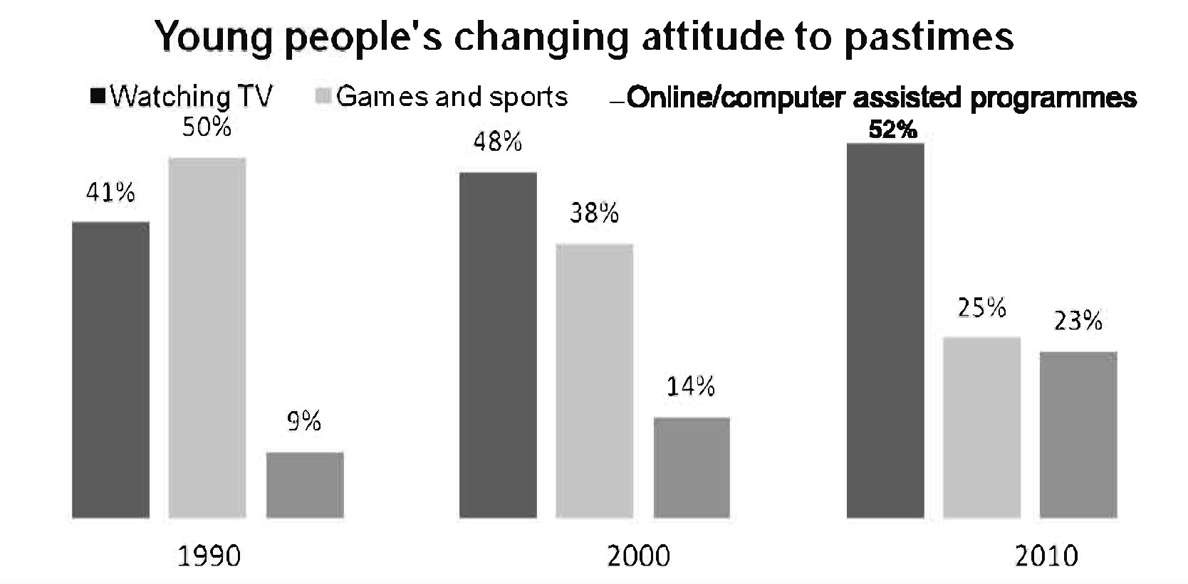 There is change in people's preferences for pastimes. A recent survey shows that during the last twenty years, teenagers have gone through significant changes in choosing their pastimes. The survey results are presented through a graph which shows that there is a steady rise in young people's tendency to watch TV. In 1990, 41% of teenagers liked watching TV which increased to 48% in the next ten years and it further increased to 52% in the next decade. Unfortunately, the picture is grim in terms of young people's attraction to field games and sports. While 50% of youngsters opted for games and sports in the 1990s, the figure was 12% less after a decade at 38%. Unfortunately the falling tendency persisted through the next ten years and by 2010 it came down to 25%. Though the young people have dissociated themselves noticeably from games and sports, there is a sharp and steady rise in their association with online or computer assisted programmes. In 1990 when the users of online or computer for pastimes were only 9%, in 2000 the number nearly doubled and reached 14%, and with a rapid increase in the next ten years it shot up to 23%.
