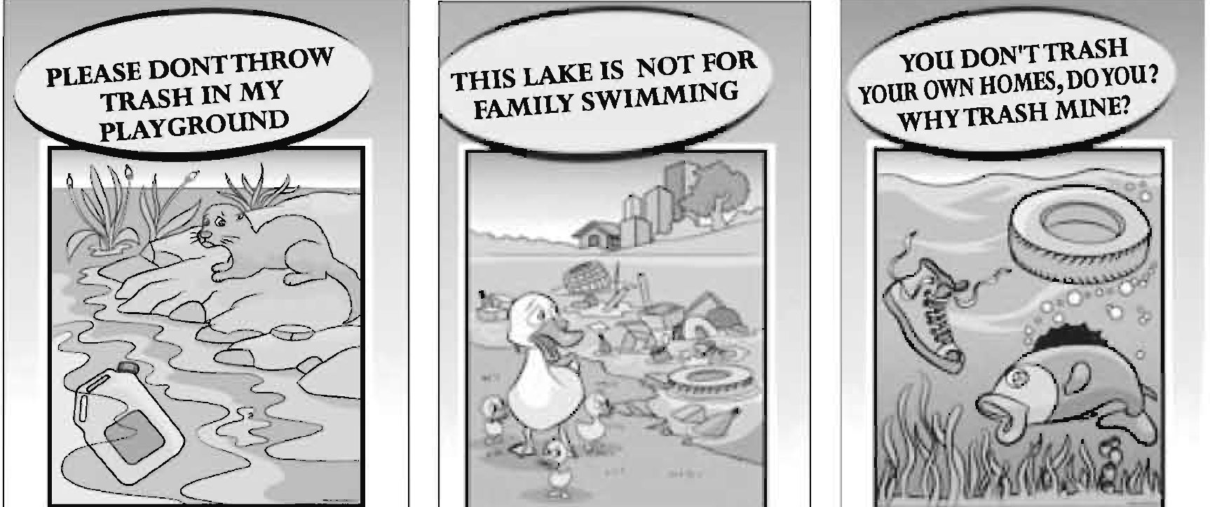 I like the third poster most. It shows a fish swimming around the waste material thrown in the water bodies by humans. The water is the home for the fish but we humans are filling it with the waste of our own. Fishes cannot speak. But here, we can see what the fishes would have told if they had a voice of their own. This poster really opens our eyes to the severity of the pollution problem.