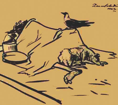Group C : Picture 3 portrays the famine of 1940. It is a pathetic scene. A dead body is lying and a dog and a crow are eating the dead body.