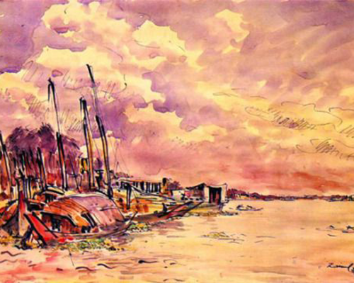 Group E : Picture 5 portrays the picture of a village by the side of a river. We see that the sky is covered with clouds.