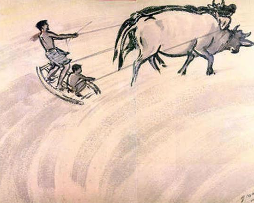 Group F : In the picture 6 two farmers are seen on a leveler that is drawn by two oxen. They are levelling the soil and pulling the oxen by ropesto keep balance.