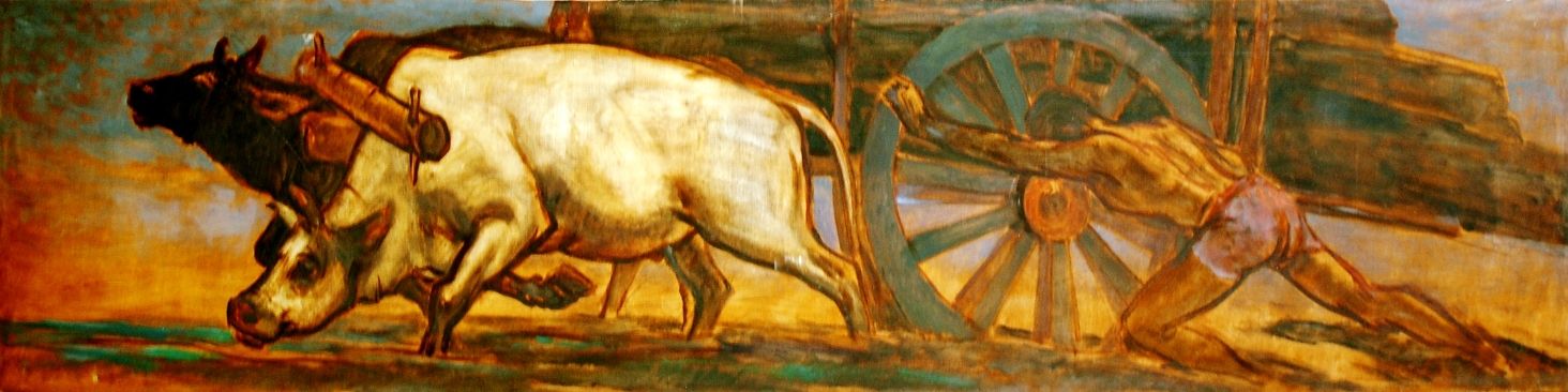 Group G : In picture 7 a struggle is portrayed. Two oxen and a man are struggling hard to draw a cart laden with wood.