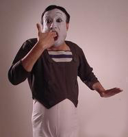 S2 : I think he is middle aged. He has taken make-up on his face. He is wearing a dress generally used in mime. He has medium sized hair on his head.