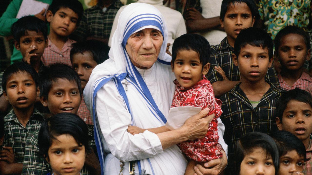 We can see Mother Teresa holding a baby on her side. She is also standing in the middle of other children. She seems like a calm, quiet and affectionate person.