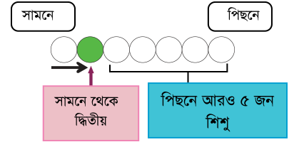 নিচের ৫ জন শিশুর মধ্যে আলিকে খুঁজে বের করতে হবে । তার বন্ধু বলল, আলি দ্বিতীয় আসনে বসেছে । অপর এক বন্ধু বলল, আলির ডানদিকে ৩ জন শিশু আছে । ছবিতে আলিকে খুঁজে বের করে রং কর । ( ছবিতে ক্লিক করি )