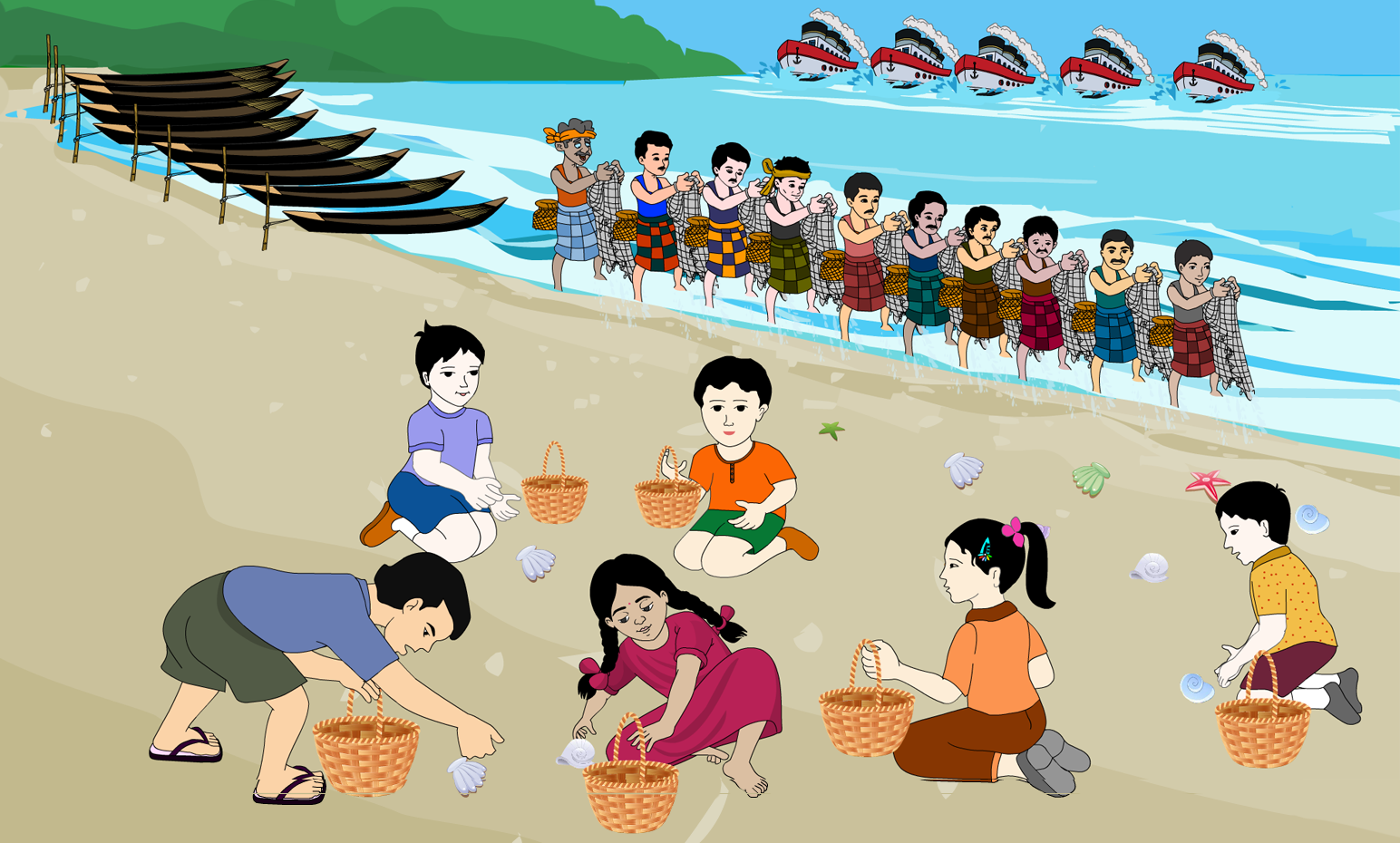 ৩। ছবিতে কয়জন ঝিনুক কুড়াচ্ছে তা কথায় লিখি।