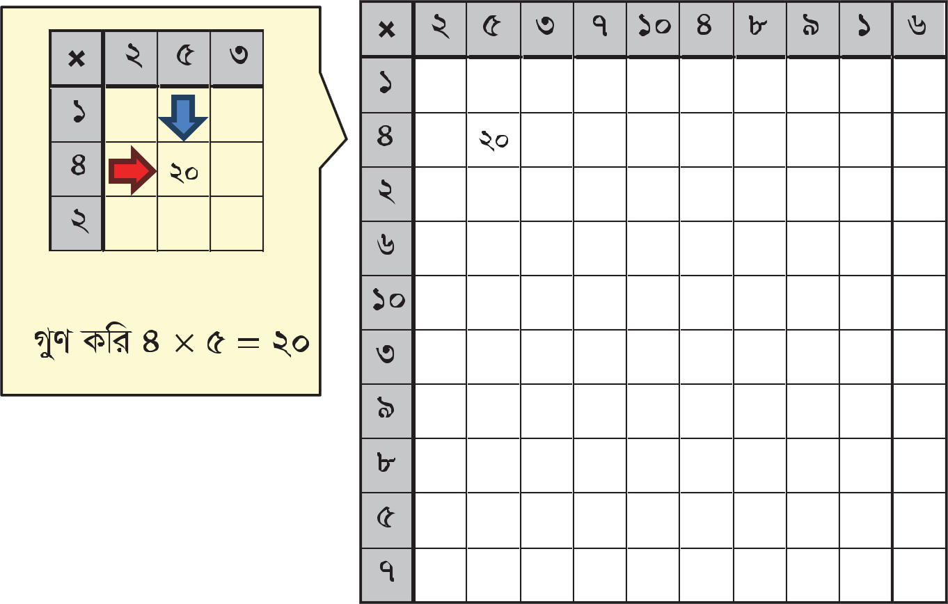বামদিকের কলামের সংখ্যা দিয়ে উপরের সারির সংখ্যা গুণ কর এবং খালিঘরে ফলাফল লিখে পূরণ কর।