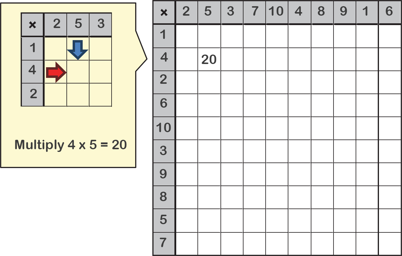 Multiply the numbers in the left column by the numbers in the top row, and fill the result in the blank boxes.