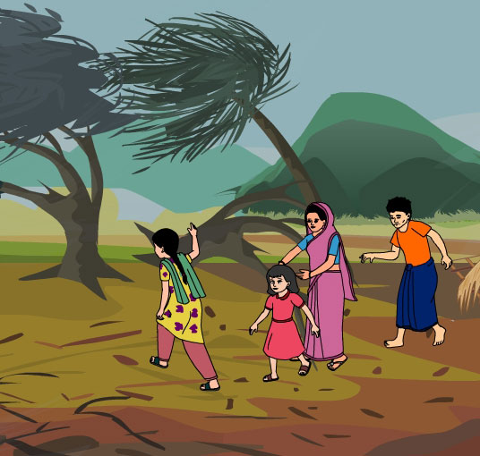 Babul's father told him what happened that day. There was light rain in the morning on 25 May. In the afternoon, the wind started to blow and people began to run for their homes. Babul's father closed his shop and his mother came home. His grandparents checked the family's emergency kit. Their torch was working and they had extra batteries. They put the torch, batteries and first aid kit in plastic box.