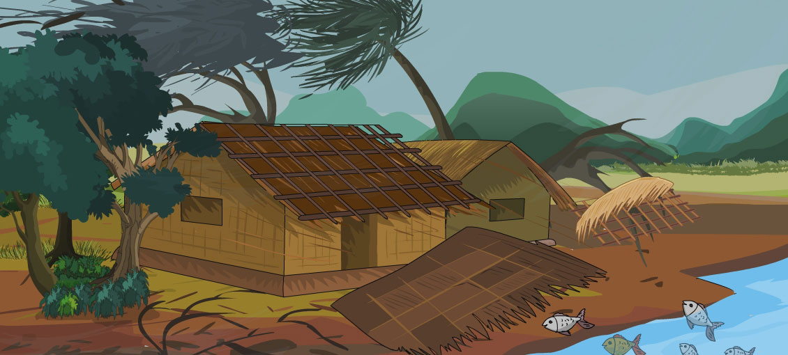 By the evening, the river was rising. The winds of Cyclone Aila shook the walls of the house as if there was an earthquake. Everyone was afraid. Nipa began to cry. Suddenly, there was an awful noise and the family's roof blew away! The sky was dark, but the family could see trees flying over their heads. Grandmother still says she saw fish flying through the sky.