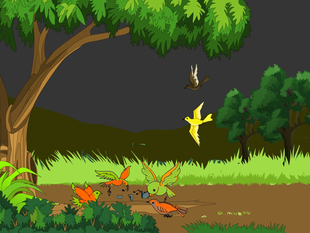 In the morning, as the sun came up, the birds went out to have their breakfast. With their good eyes, the birds saw the little pieces of the beautiful voice on the ground. They carefully picked up the pieces. They didn't leave one piece of the beautiful voice behind.