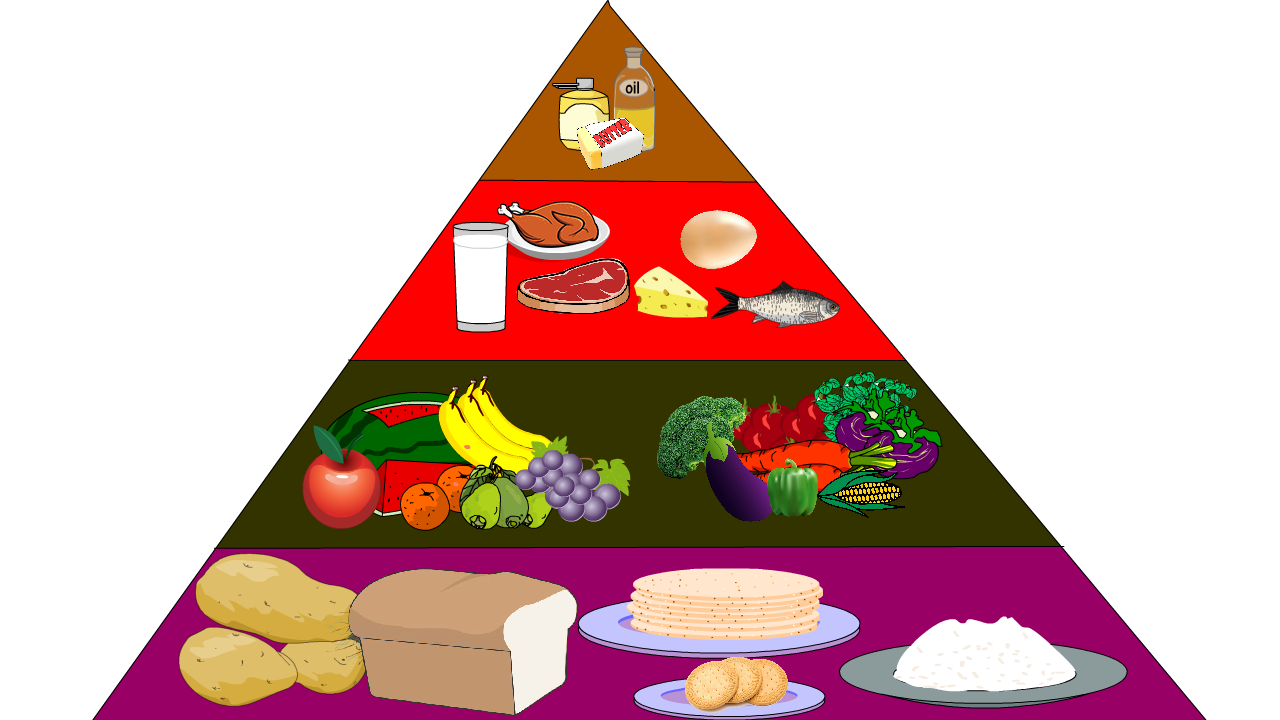 Look at the picture of the Food Pyramid. We eat more of the foods at the bottom of the pyramid. What foods do you see at the bottom? These are things made from grain, for example, rice, ruti and bread. Potatoes are not grains, but they are similar. Grains give us energy.