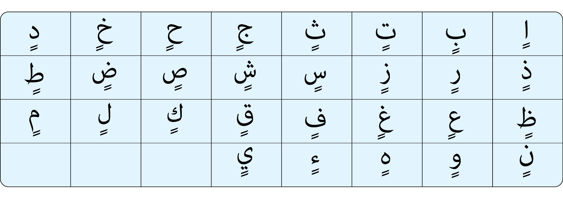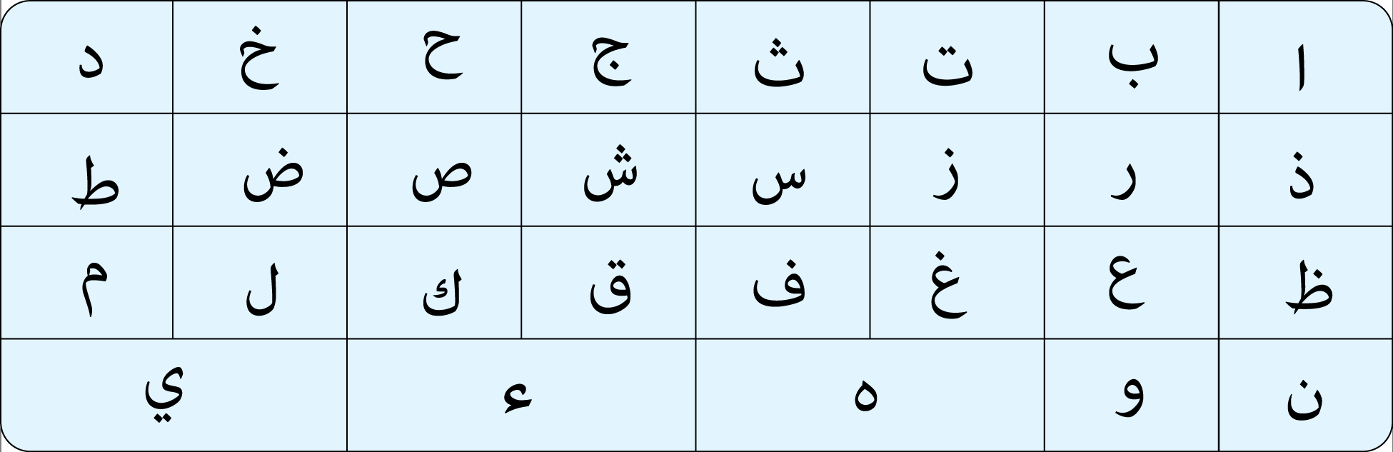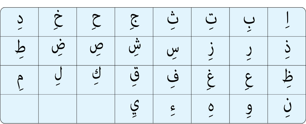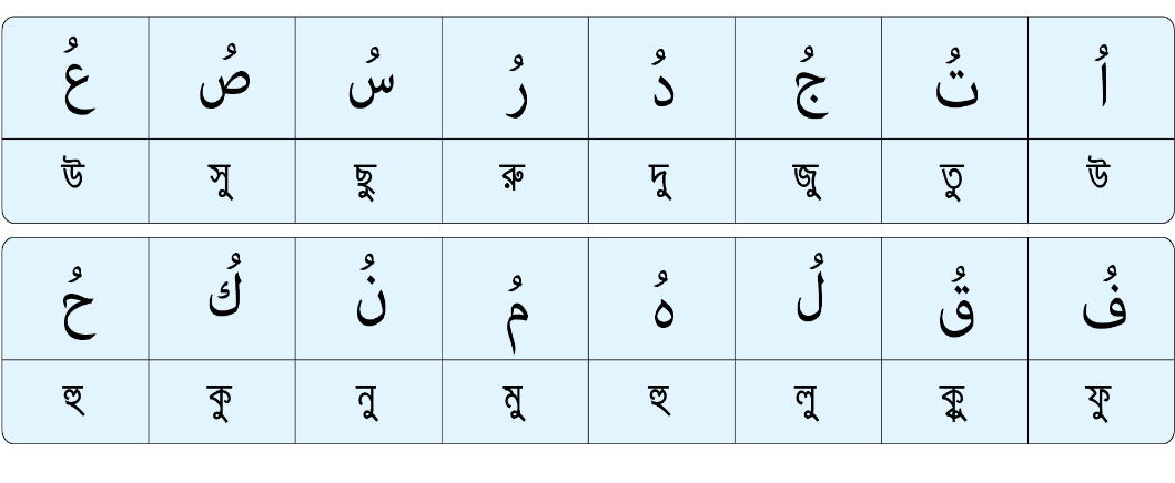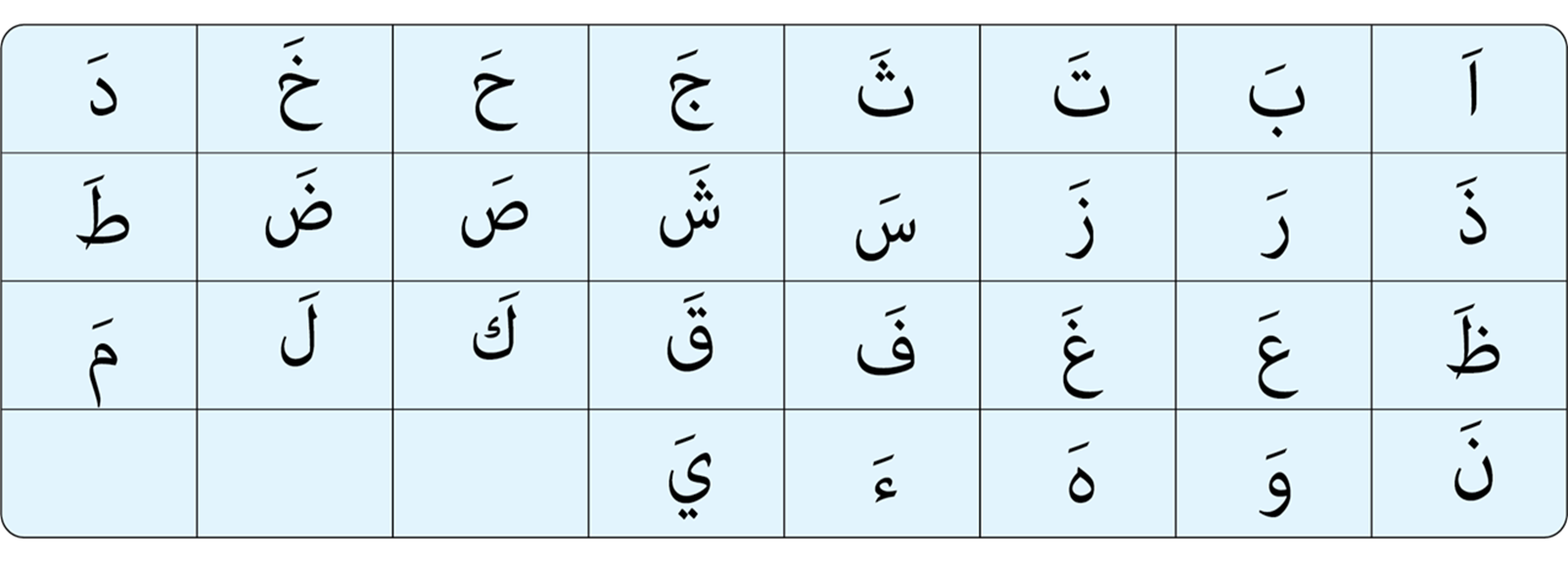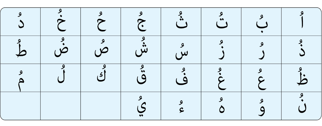 কুরআন মজিদের ভাষা আরবি। আরবিতে ২৯ টি অক্ষর বা হরফ আছে। আরবি পড়তে ও লিখতে হয় ডানদিক থেকে।