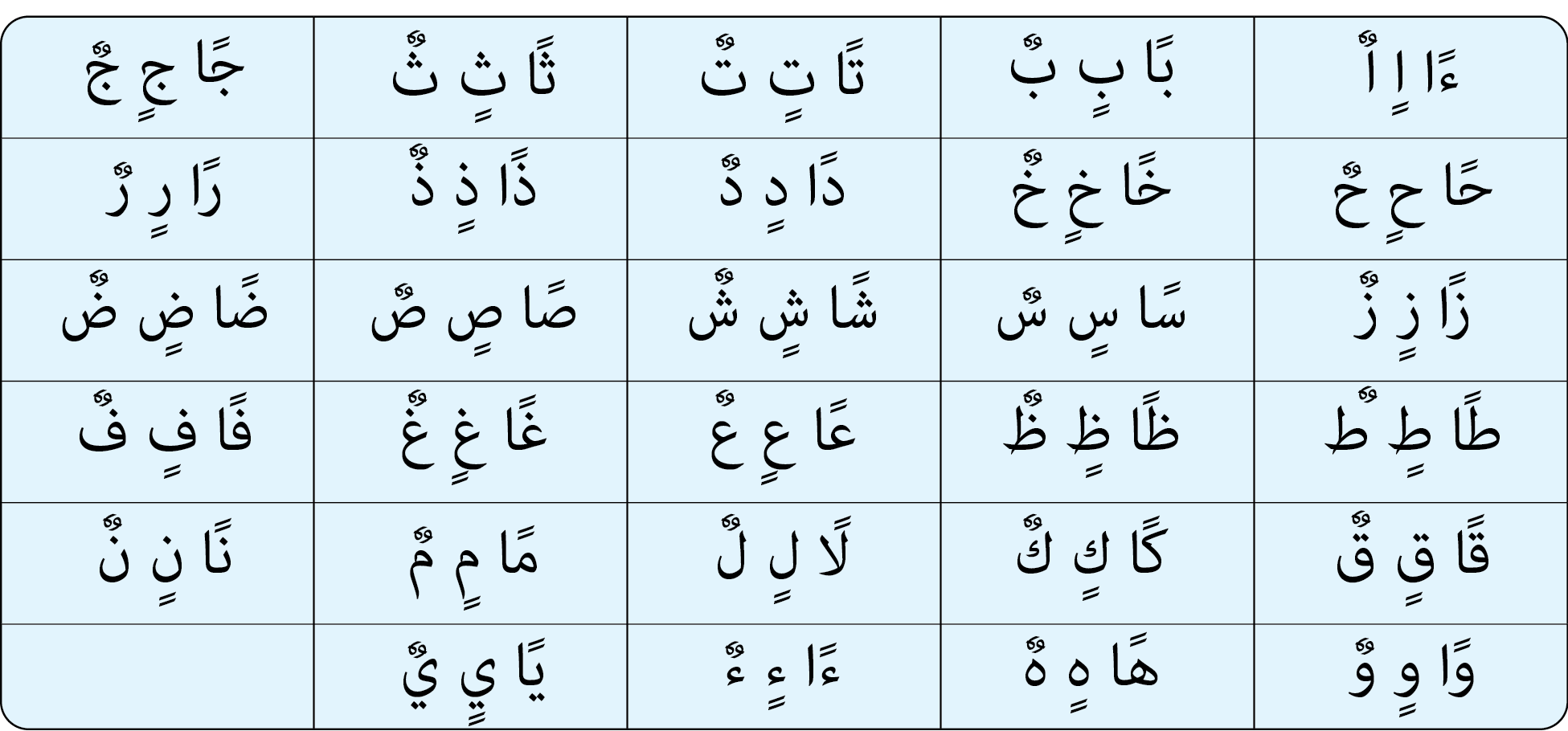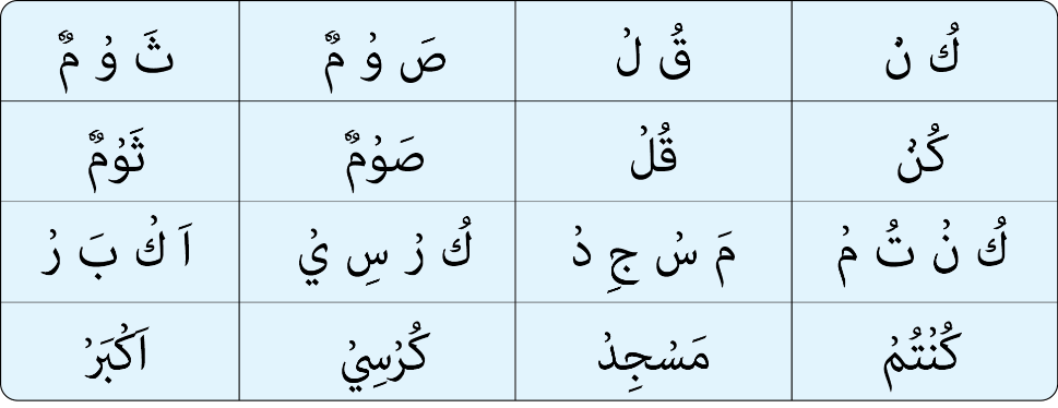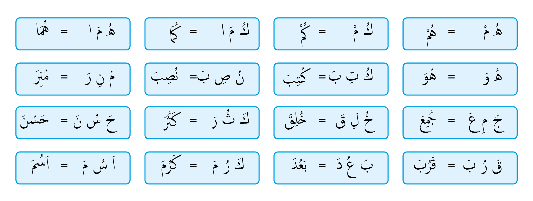 Such as: ﻛَﺘَﺐَ Kaf jabar ka, Ta jabar ta, Ba jabar ba = Kataba