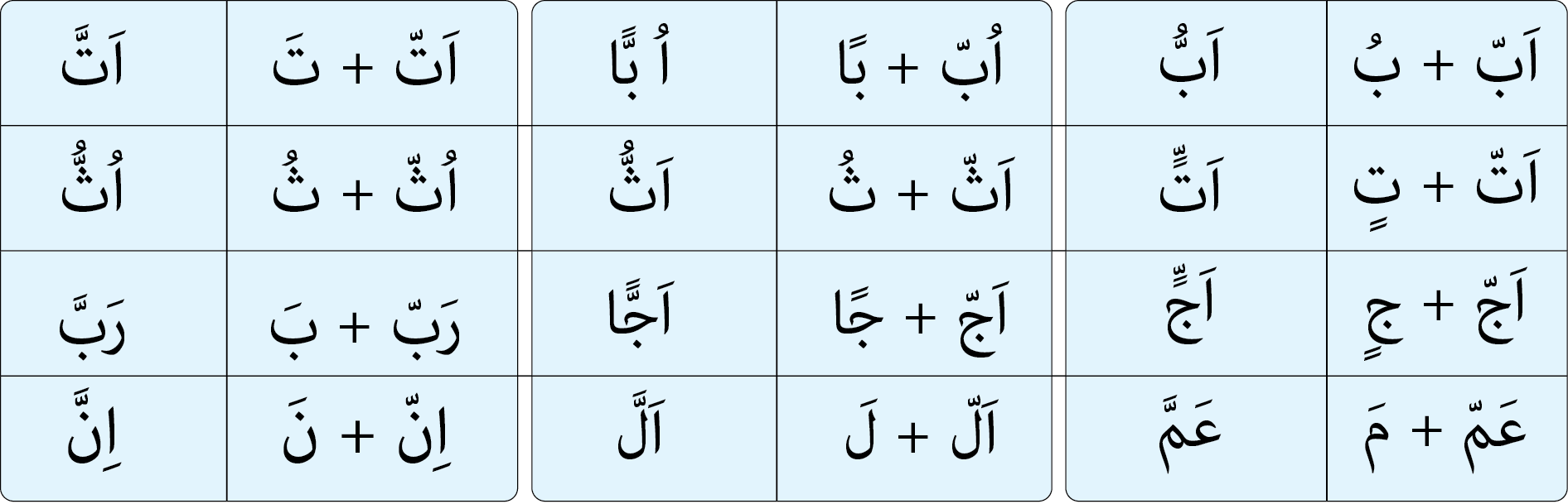 Example: ﺍﻥَّ ﻥَ = + ﺍَﻥْ = Alif Nun Zabor An, Nun Zabor Na = Anna