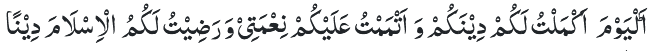 Meaning: “This day I have perfected for you your religion and completed My favor upon you and have approved for you Islam as religion.”